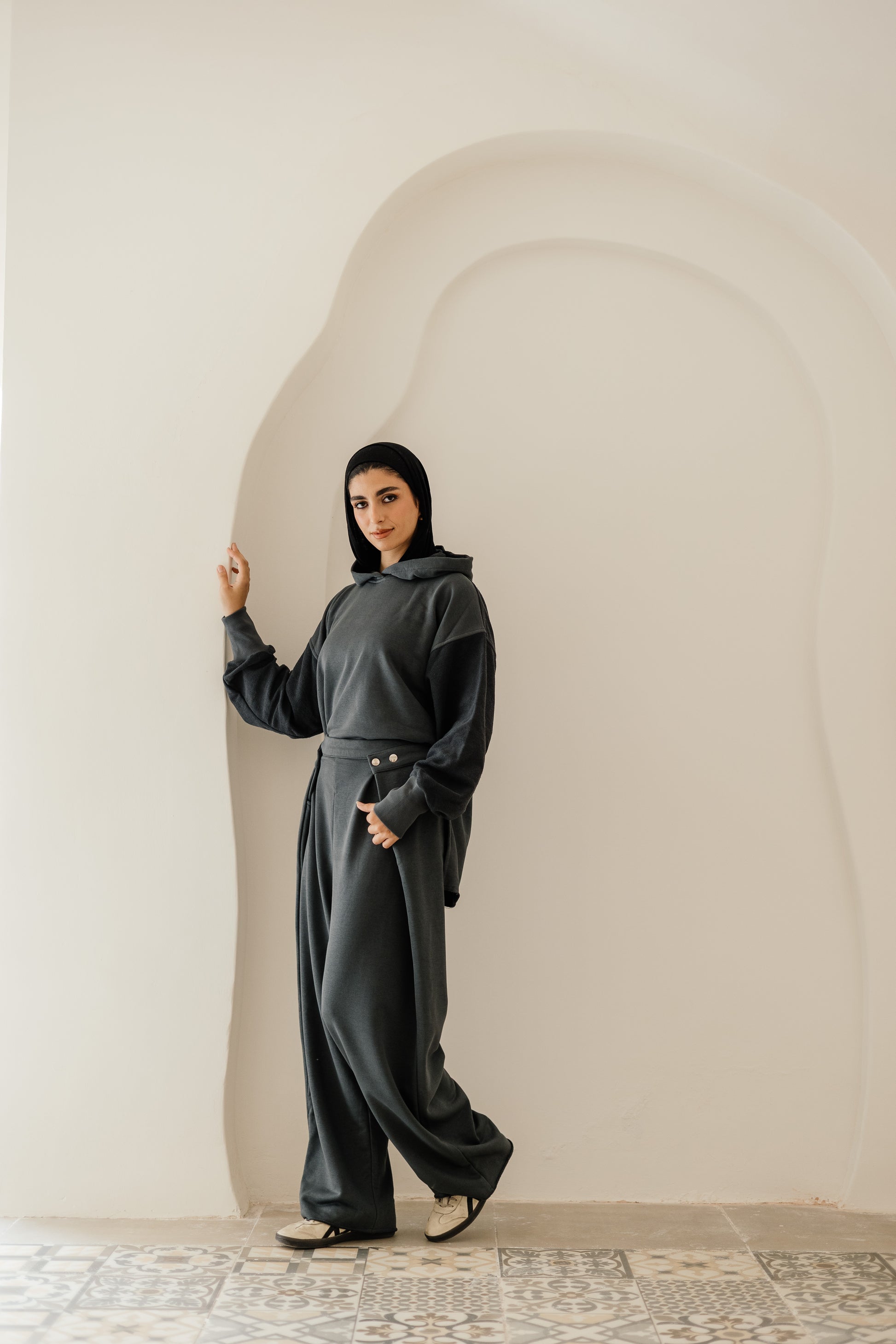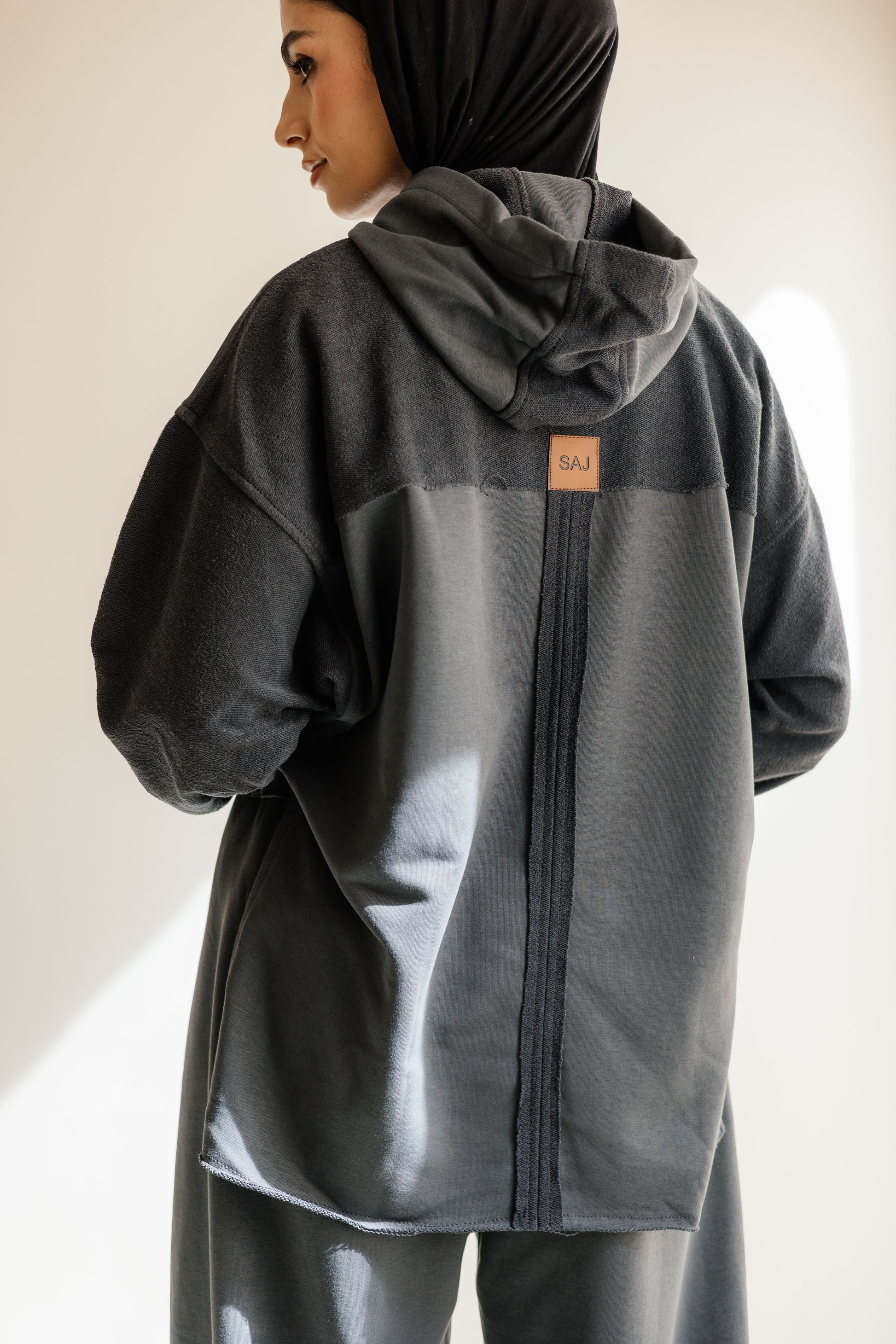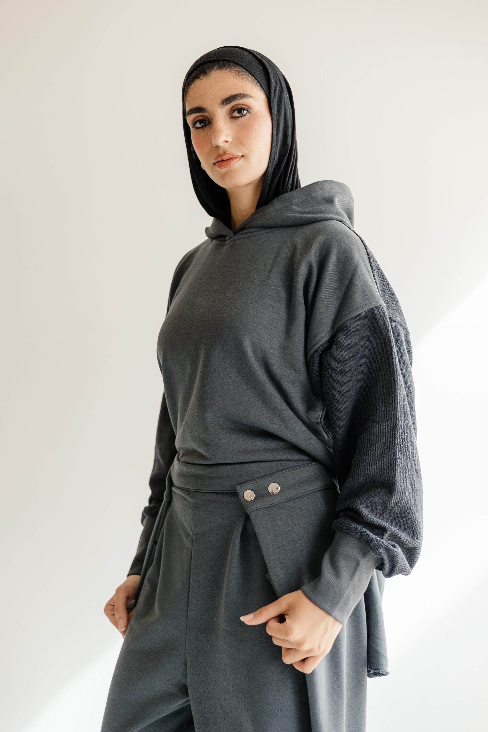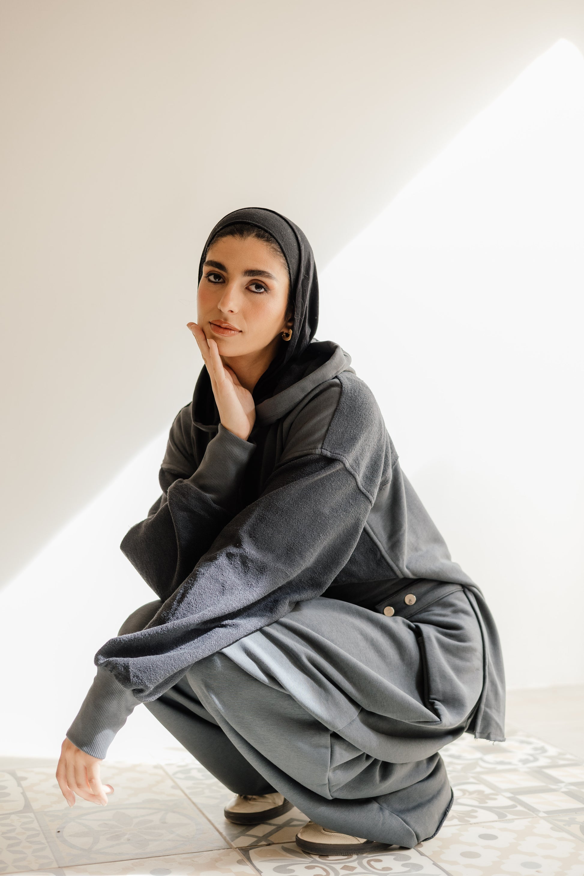 The sweatshirt is minimal, chic, and modest, with a soft hood and premium cut that flatters without being oversized.