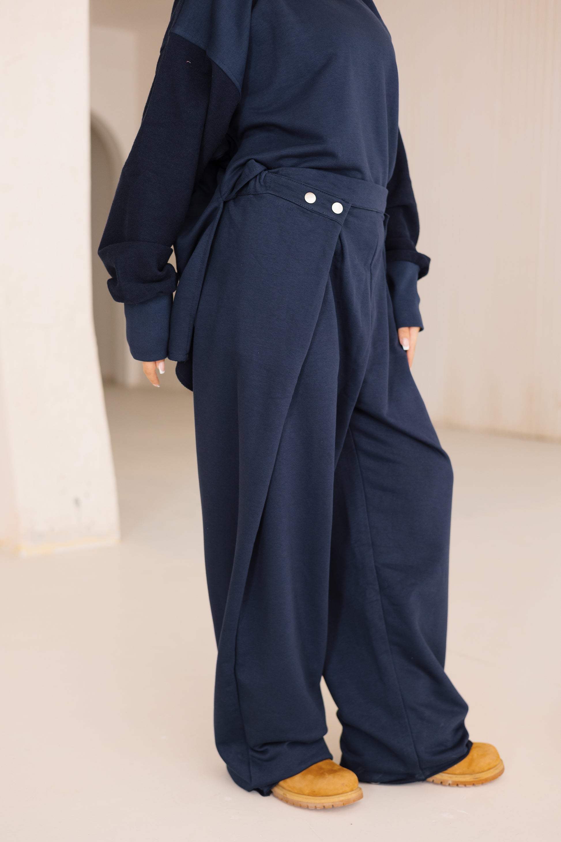 The wide-leg pants feature structured capsules at the waist, giving a flattering fit on top while flowing elegantly down.