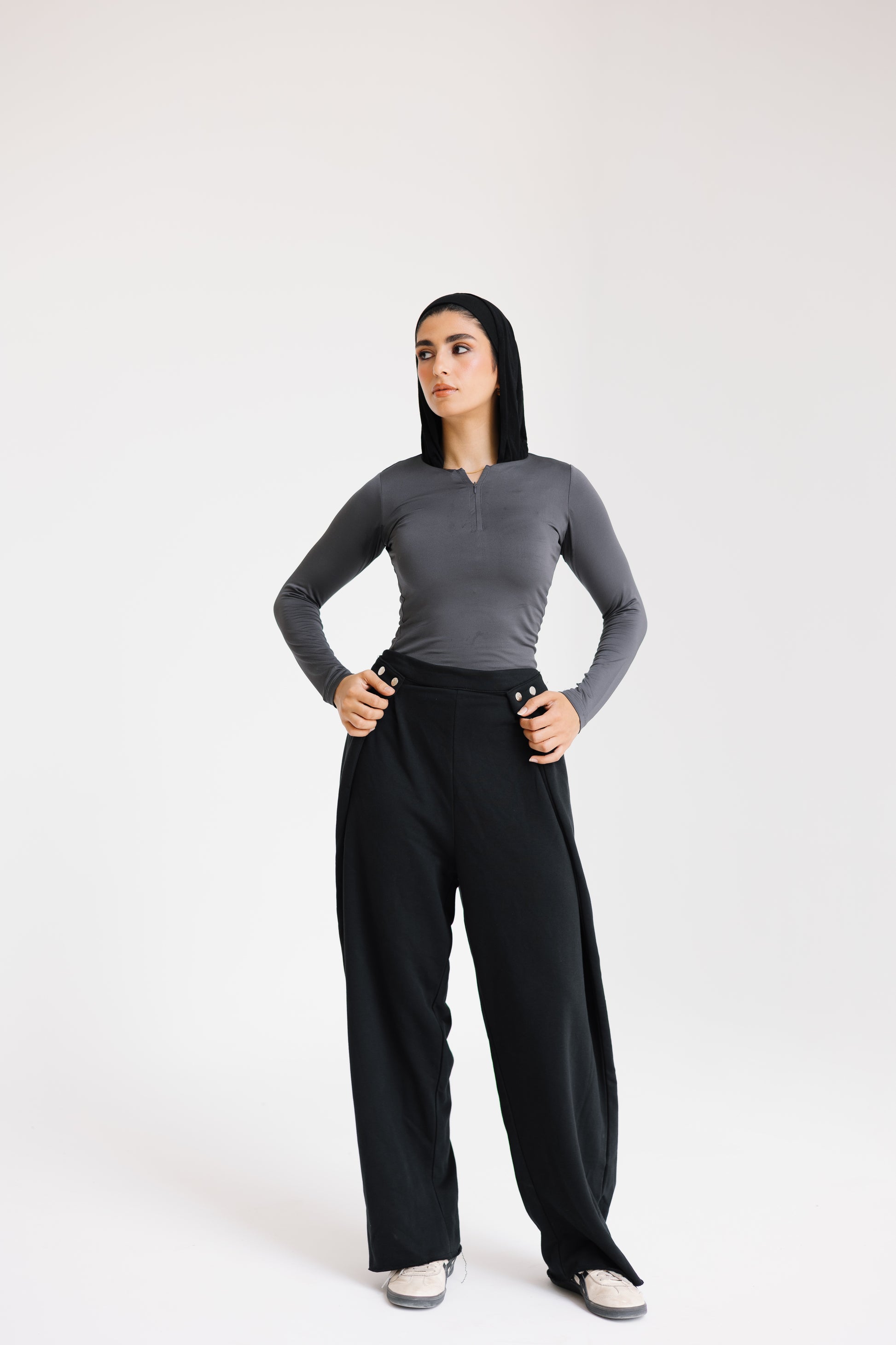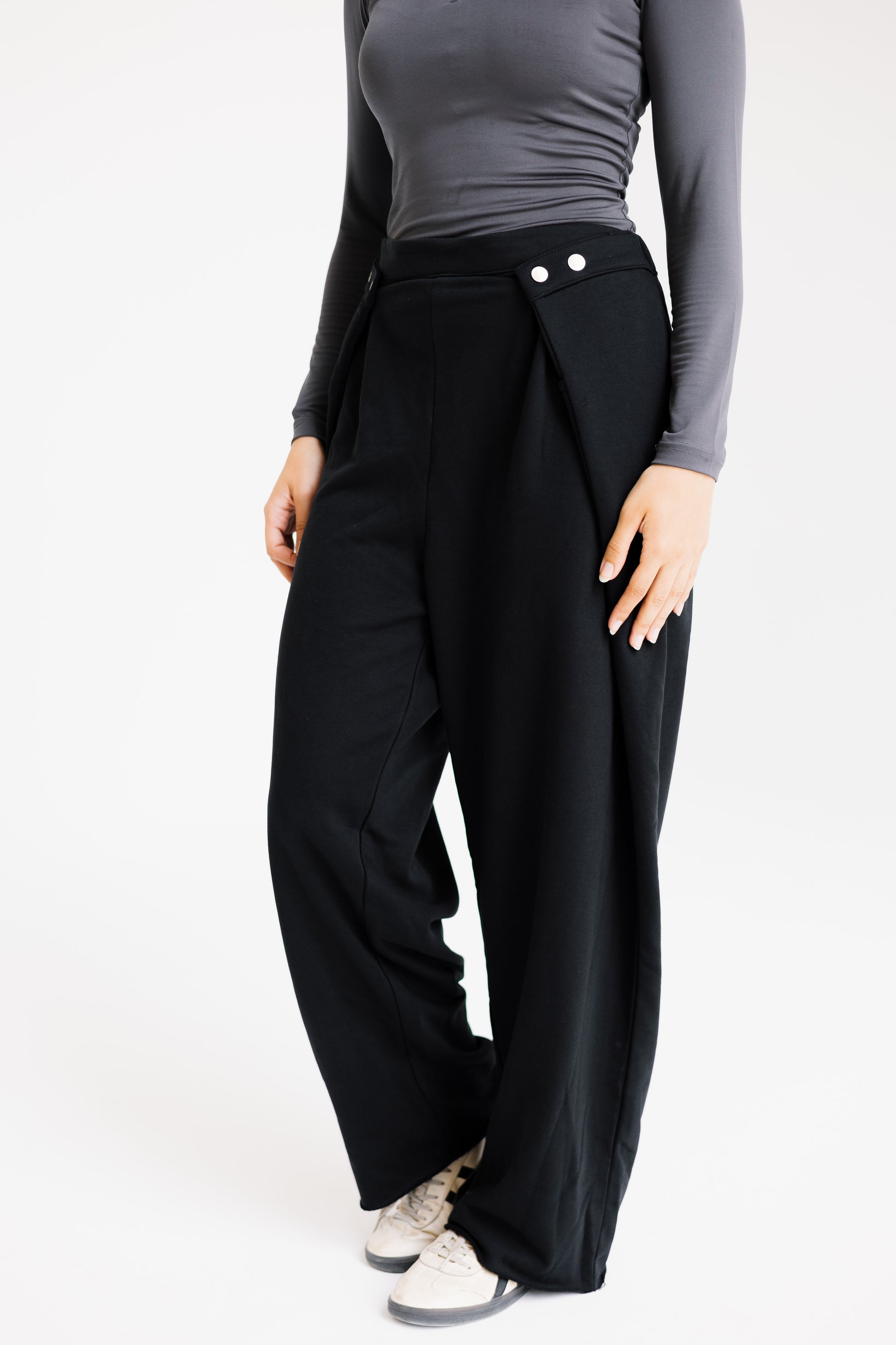 The wide-leg pants feature structured capsules at the waist, giving a flattering fit on top while flowing elegantly down.