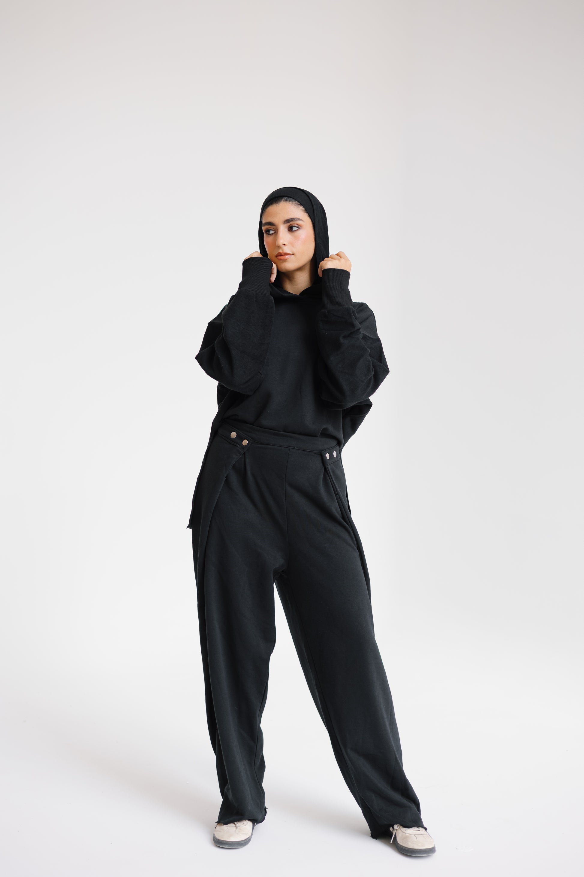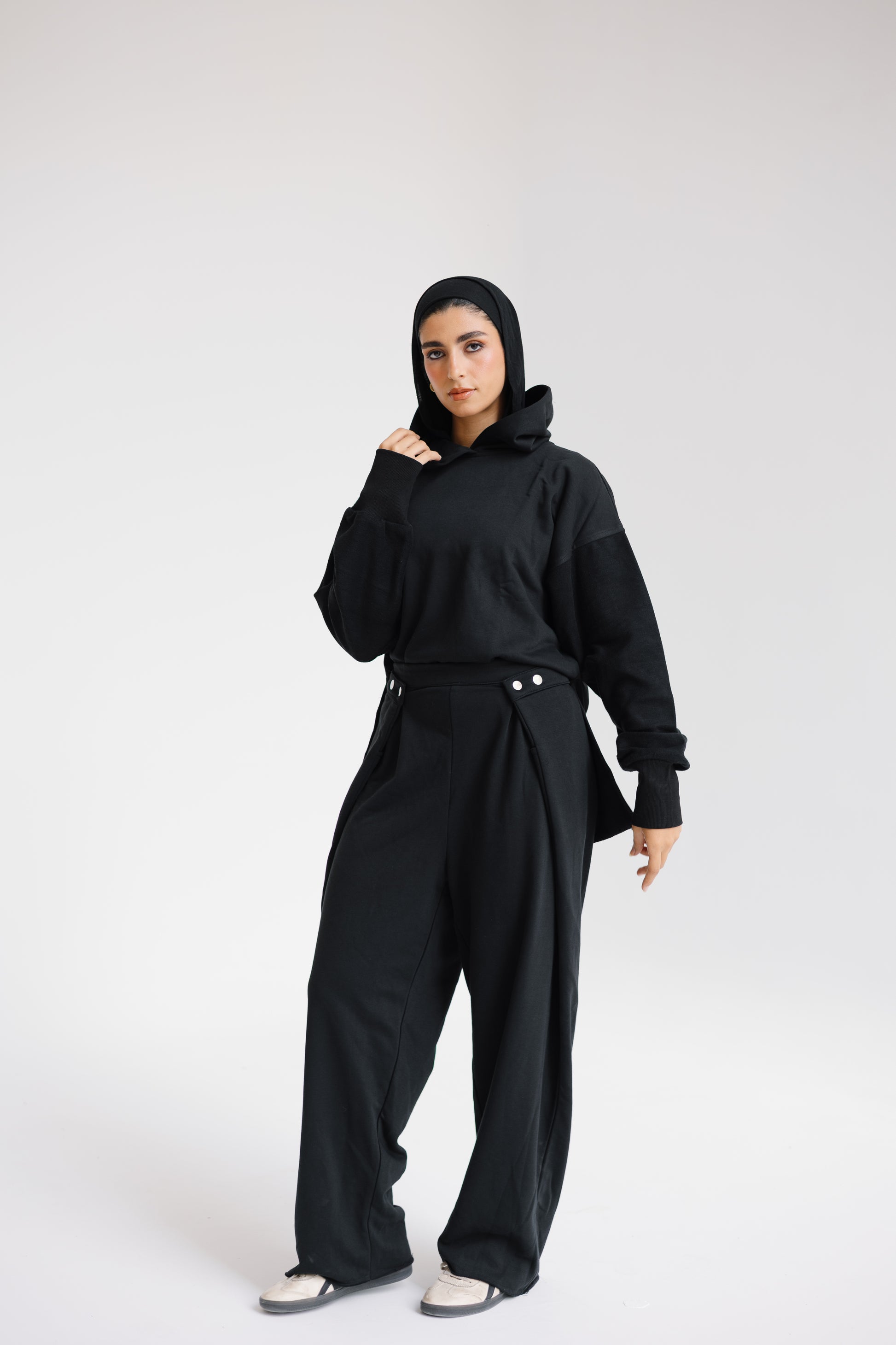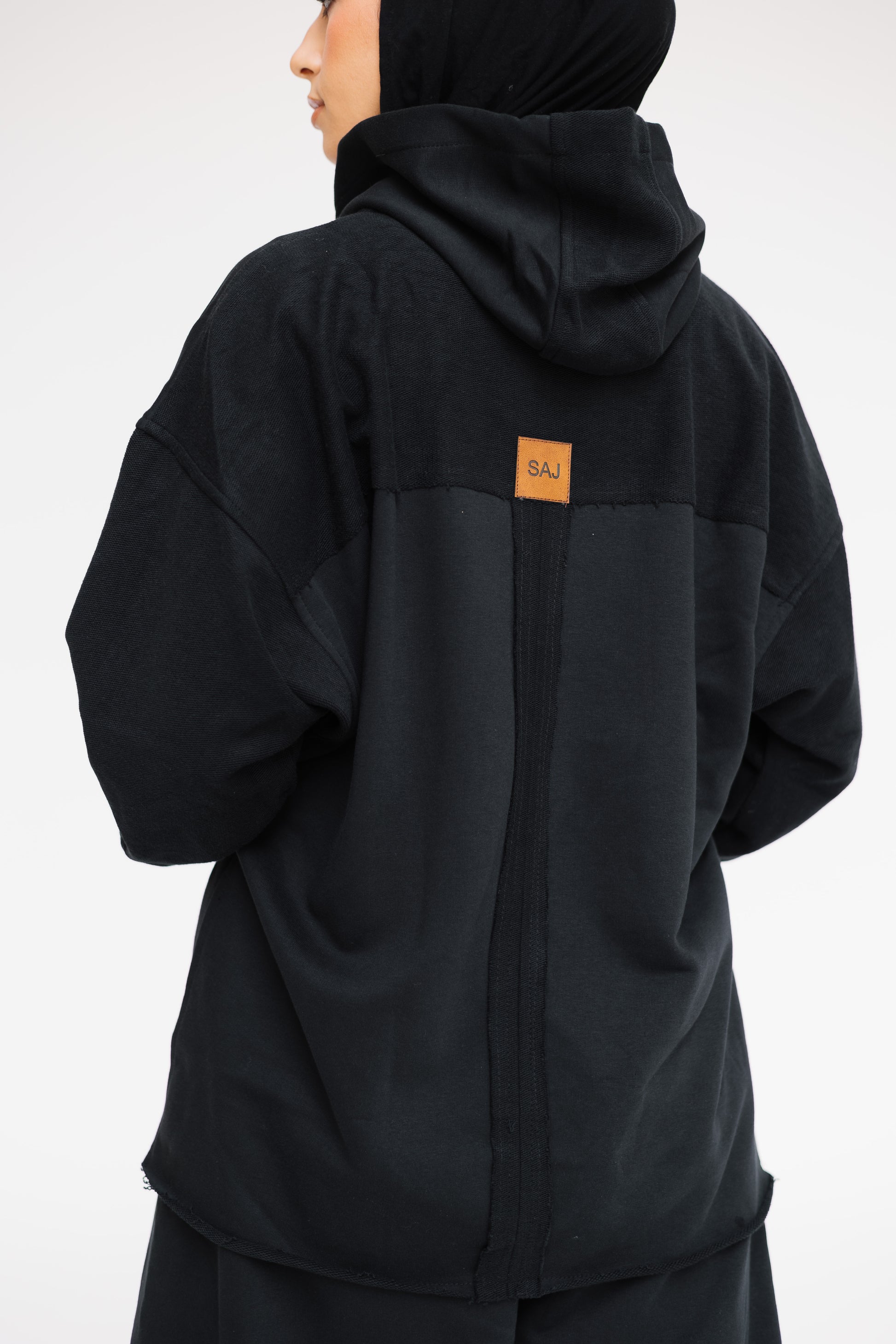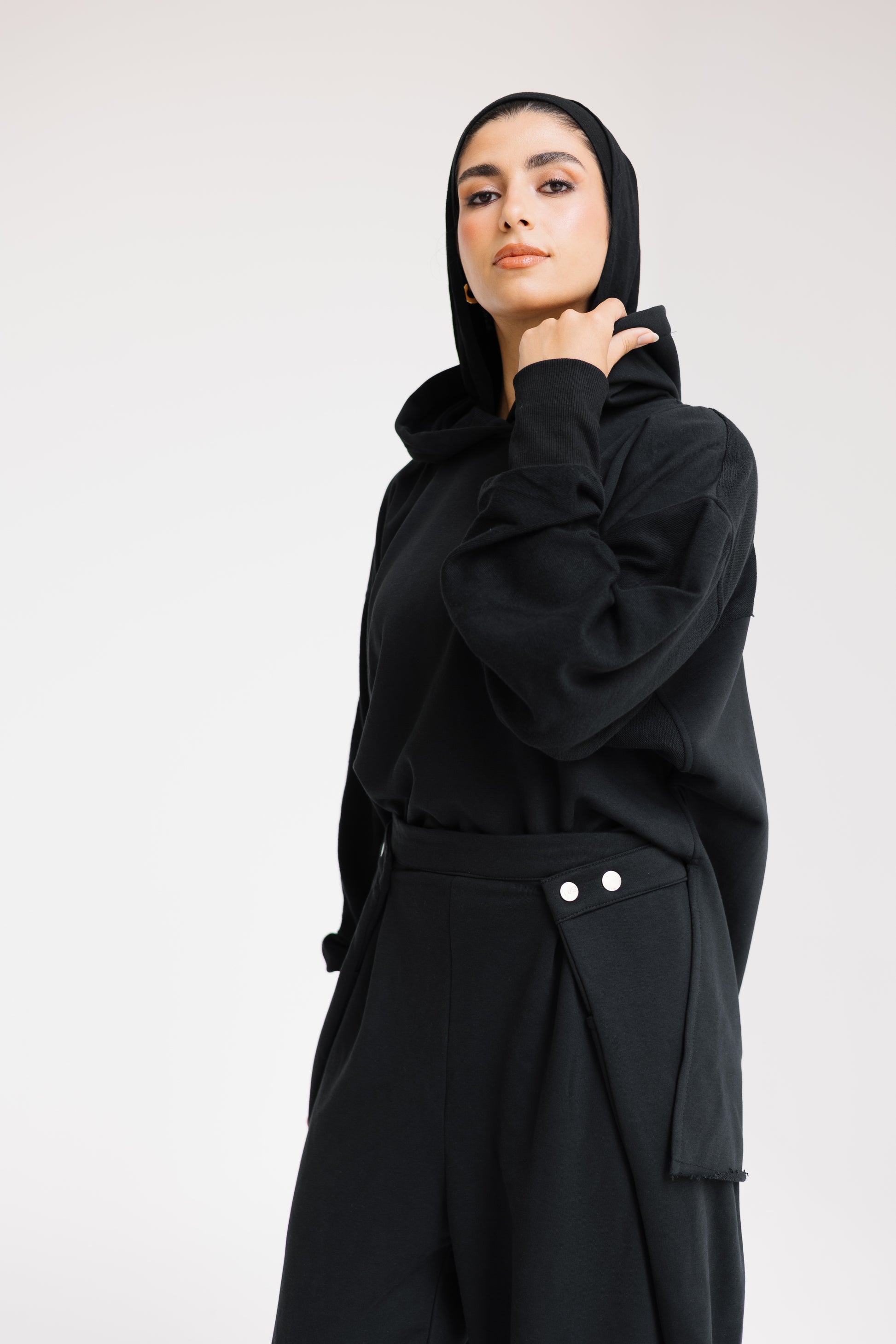 The sweatshirt is minimal, chic, and modest, with a soft hood and premium cut that flatters without being oversized.